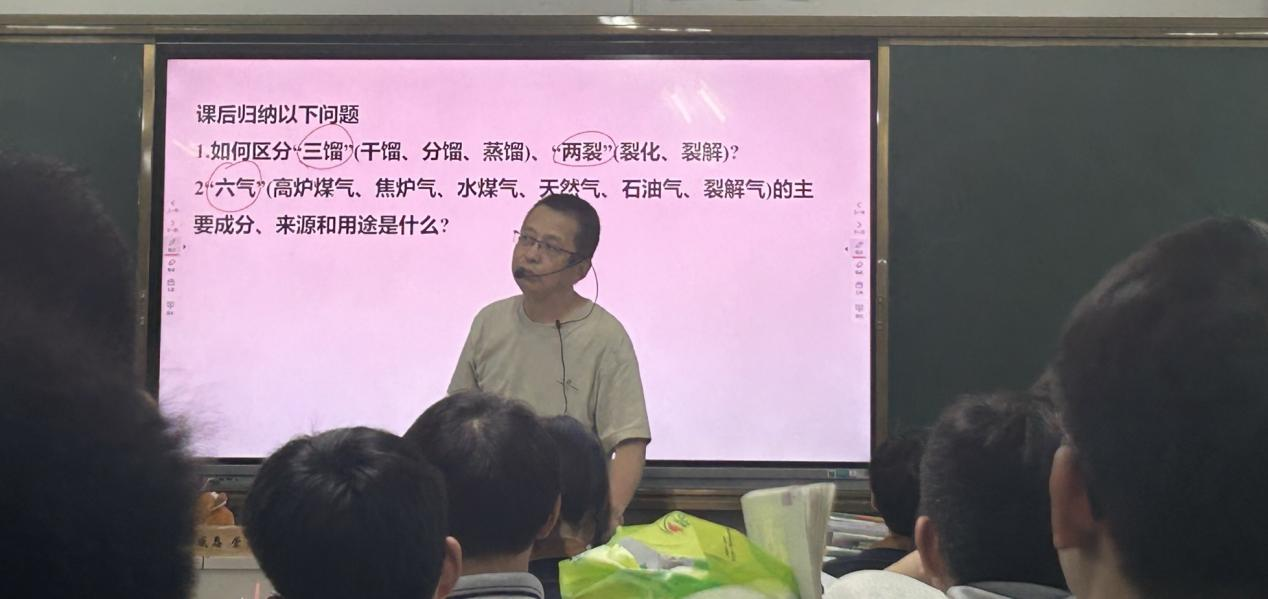 5 月 14 日,趙王峰老師開展了《煤、石油和天然氣的綜合利用》課程教學。課堂伊始,趙老師巧妙地提出 5 個關鍵問題,迅速激發(fā)了學生們自主學習的熱情,引導他們帶著問題深入探究能源綜合利用的奧秘。在教學過程中,趙老師深入淺出的講解,讓學生們對復雜的能源轉化過程有了清晰的認識。在歸納總結環(huán)節(jié),趙老師讓學生自主梳理“兩裂”“三餾”和“六氣”等重要知識點,這一環(huán)節(jié)不僅加深了學生對課堂知識的理解,還促進了其自主學習與知識整合能力的提升,確保了課程內容的嚴謹與完整,顯著提升了教學效果。