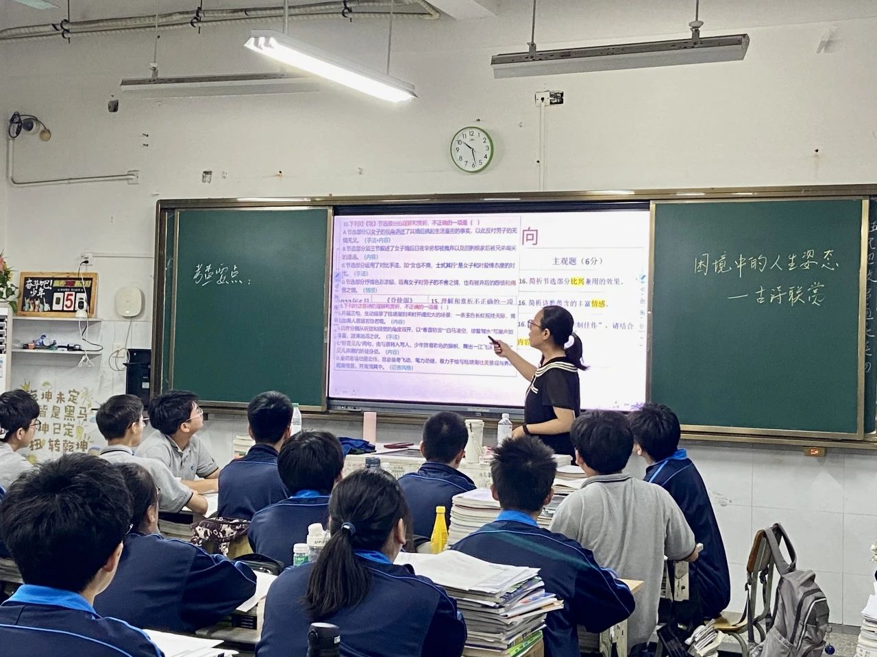 汪秀勤老師以《困境中的人生姿態(tài)》為題,開展選必下冊四首古詩詞聯(lián)讀教學。課堂以準確理解四首古詩詞的核心內容、關鍵意象、藝術手法為目標,分析四位不同時期的詩人展現(xiàn)的不同人生困境及其應對方式,引領學生感悟古詩中蘊含的面對人生逆境的智慧與態(tài)度,思考其現(xiàn)實意義。這堂課既是一堂精彩的古詩鑒賞課,更是一堂深刻的人生教育課。汪老師以詩為媒,不僅教會學生解讀古詩的方法,更引導他們在經典閱讀中建構精神家園,培養(yǎng)“窮且益堅”的生命韌性,展現(xiàn)了語文課程“以文化人”的獨特價值。
