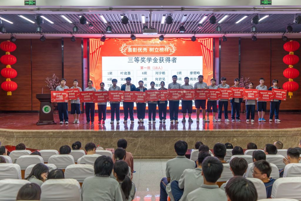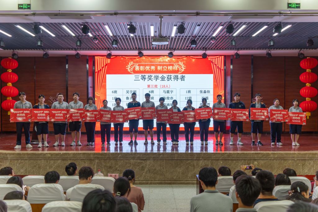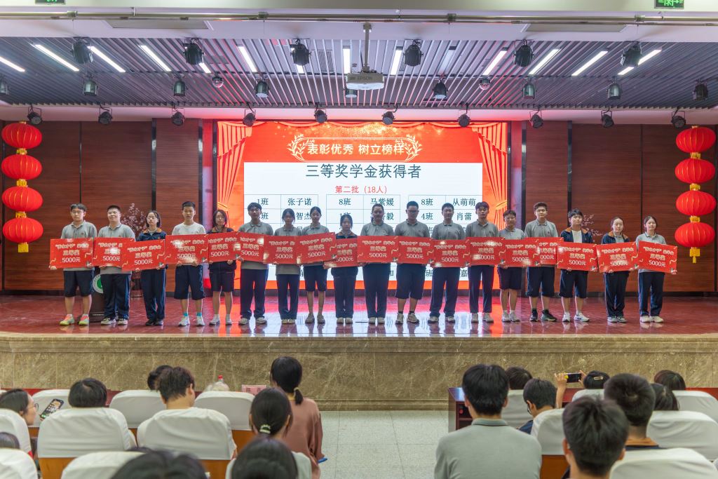 頒獎環(huán)節(jié)將典禮推向高潮。激昂的頒獎音樂聲中,獲獎學(xué)子依次登臺。54位學(xué)生被評為三等獎,每人獲得5000元獎學(xué)金。
