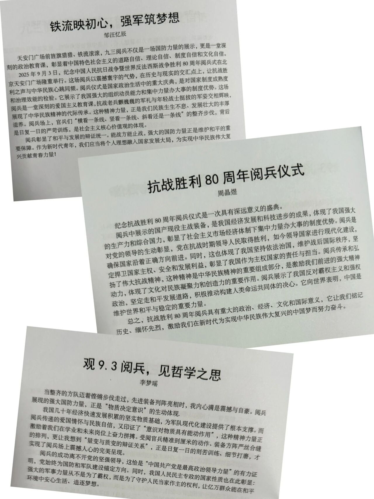高二政治備課組以閱兵精神為切入點,組織開展政治小論文撰寫活動;顒用鞔_要求同學(xué)們立足閱兵所見所感,結(jié)合愛國主義、國家制度、馬克思主義哲學(xué)等學(xué)科知識,多維度剖析閱兵背后的政治內(nèi)涵與時代意義。