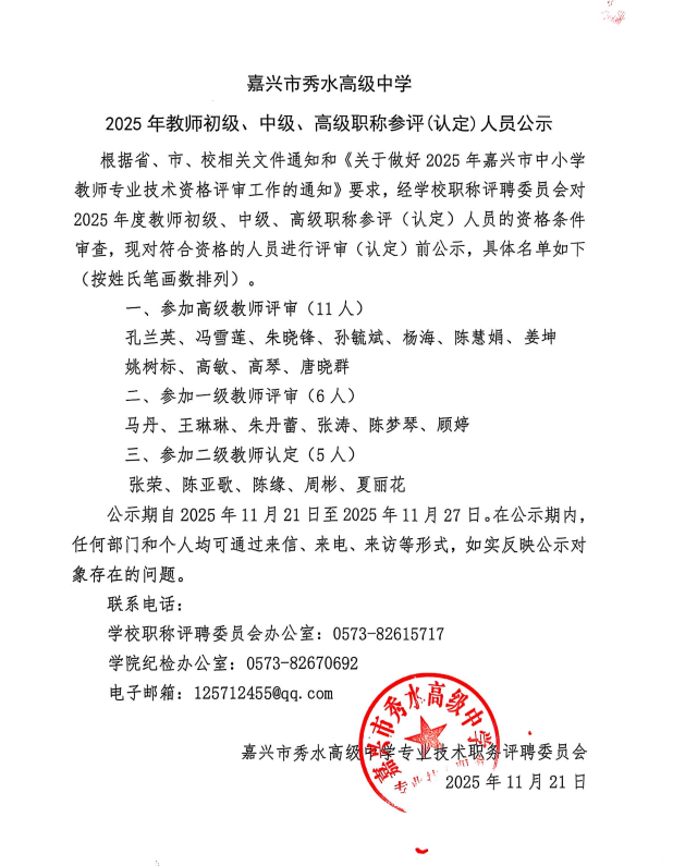 嘉興市秀水高級中學2025年教師初級、中級、高級職稱參評(認定)人員公示