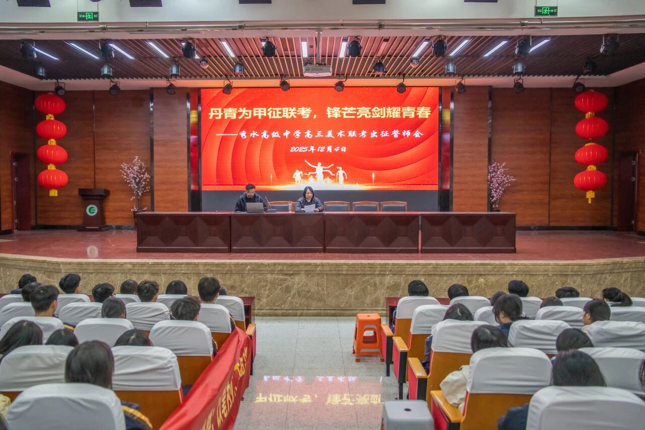 嘉興市秀水高級中學的高三美術生在考場上激戰(zhàn)正酣,而校園內(nèi)溫暖的助威力量也持續(xù)匯聚 。近日學校為2026屆美術學子隆重舉行的考前動員大會,其熱烈場景與激昂寄語,此刻正轉(zhuǎn)化為考場上的沉著從容。這場精心籌備的盛會,以滿滿的儀式感為學子們注入了信心與力量,陪伴他們提筆亮劍,迎接人生中的重要一搏。大會由高三年級組長江東升主持。